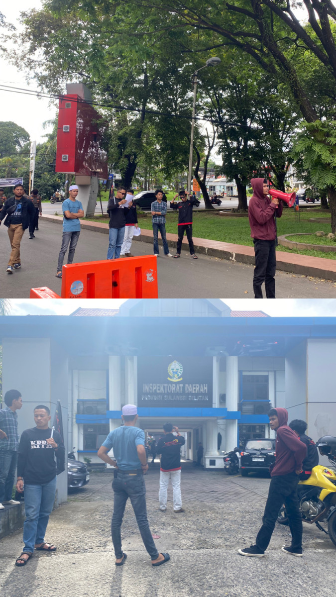 Masa aksi kembali melakukan aksi unjuk rasa di depan Kantor Inspektorat Sul-Sel untuk meminta audit terkait dasar kegiatan diluar daerah serta transparansi pengelolaan anggaran selama kegiatan